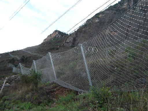 被動防護網(wǎng)主要是由鋼絲繩網(wǎng)(需攔截小塊落石時附加一層鋼絲格柵)、固定系統(tǒng)(錨桿、拉錨繩、基座和支撐繩)、減壓環(huán)和鋼柱四個主要部分構成, 前者為其特征構成。其防護能量一般為150KJ-2000KJ,特殊設防能高達5000KJ。它的主要特點就是柔性和攔截強度足以吸收和分散傳遞 500KJ以內的落石沖擊動能,消能環(huán)的設計和采用使系統(tǒng)的抗沖擊能力得到進一步提高防護網(wǎng)與剛性攔截和砌漿擋墻相比較,改變了原有施工工藝,使工期和資 金得到減少。產(chǎn)品呈網(wǎng)狀,視覺干擾下,便于人工綠化,利于環(huán)保,對于其防護區(qū)域內可以充分的保持土地、巖石的穩(wěn)固,通過人工實施植草、植樹的綠化作用。