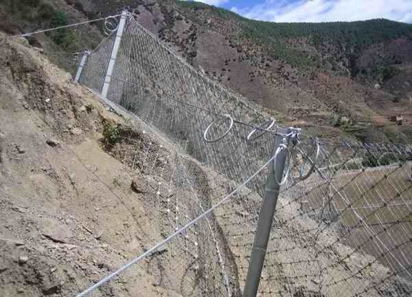 主要材質:鋼絲繩網(wǎng)、支撐繩和減壓環(huán)構造:由鋼絲繩網(wǎng)或環(huán)形網(wǎng)(需攔截小塊落石時附加一層鐵絲格柵)、固定系統(tǒng)(錨桿、攔錨繩、基座和支撐繩)、減壓環(huán)和鋼柱四個主要部分構成。